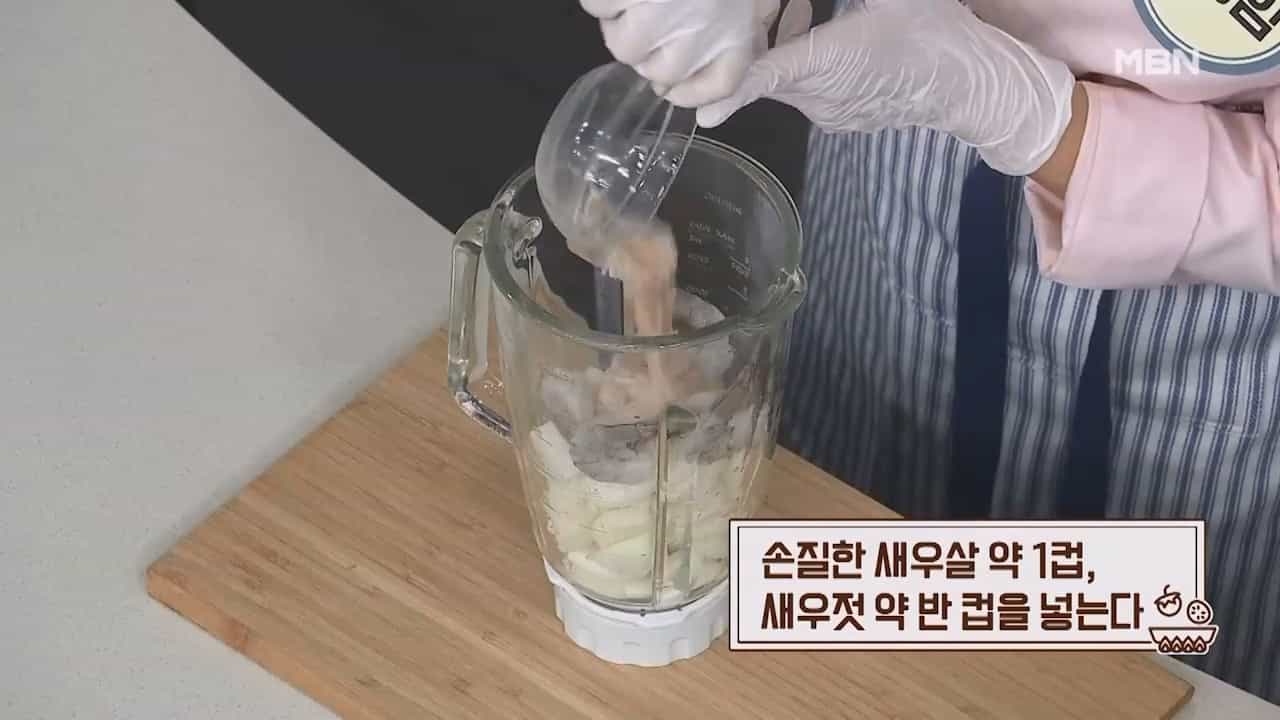9. 손질한 새우살 약 1컵, 새우젓 약 반컵을 넣습니다.
