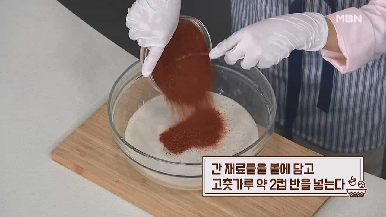 11. 간 재료들을 볼에 담고 고춧가루 약 2컵 반을 넣습니다.