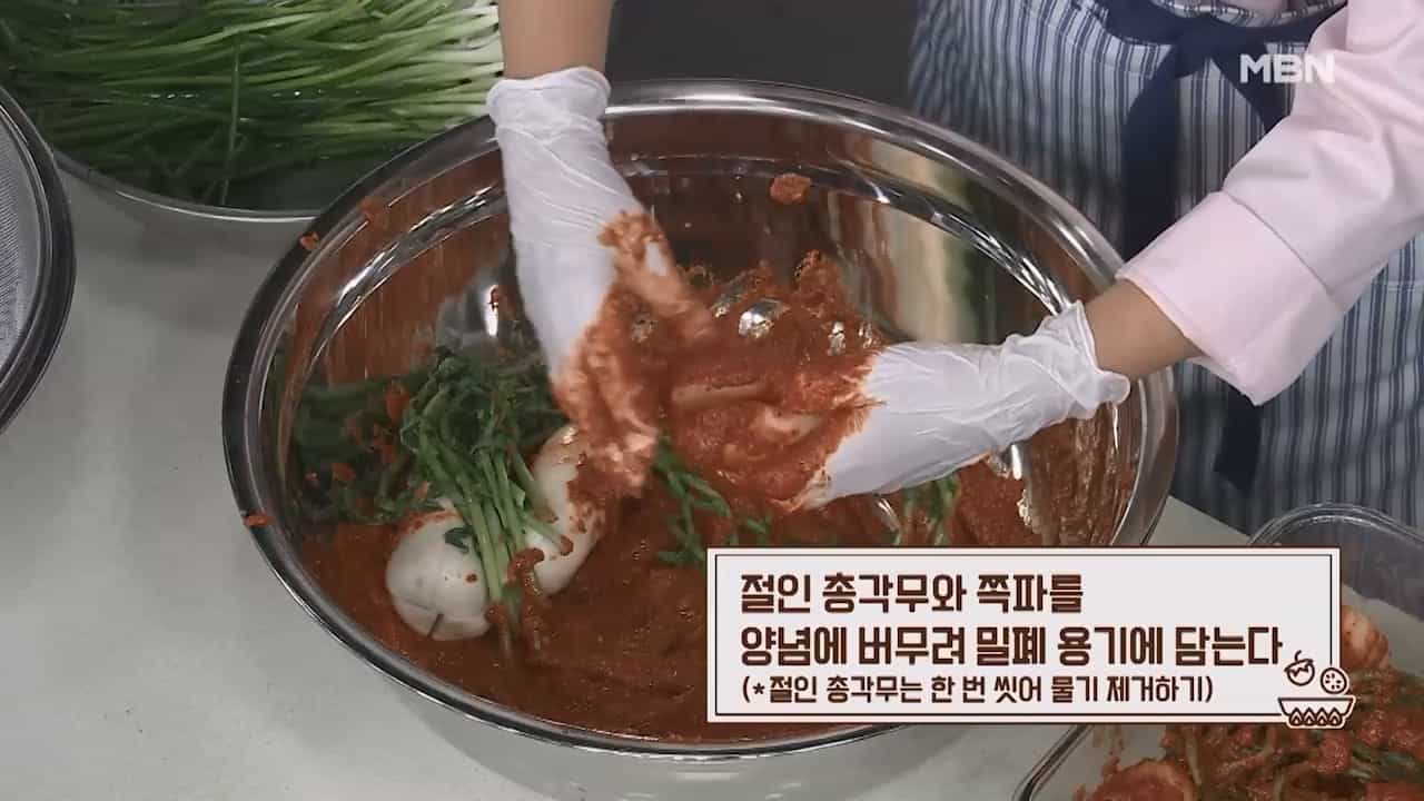 15. 절인 총각무와 쪽파를 양념에 버무려 밀폐용기에 담아줍니다. (절인 총각무는 한번 씻어 물기를 제거합니다.)