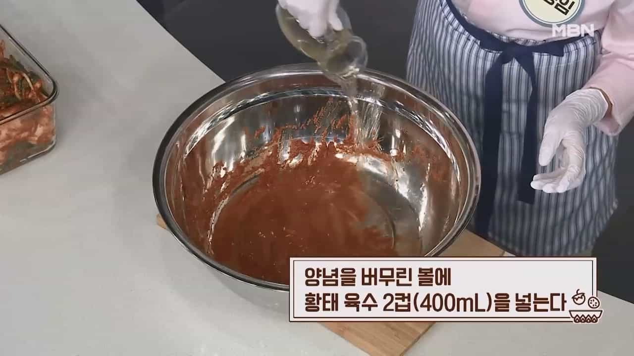 16. 양념을 버무린 볼에 황태 육수 2컵(400mL)을 넣어줍니다.