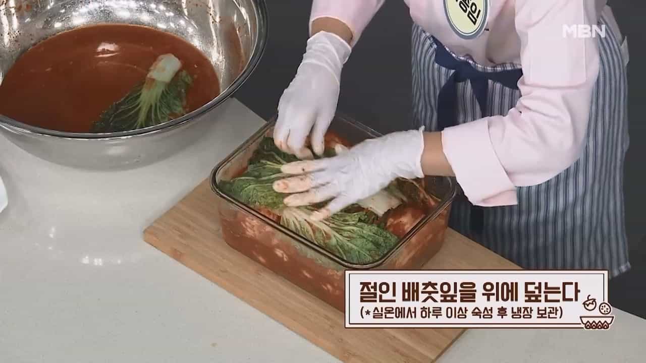 19. 절인 배춧잎을 위데 덮어주고 실온에서 하루 이상 숙성 후 냉장보관 하면 맛있는 총각김치가 완성됩니다.