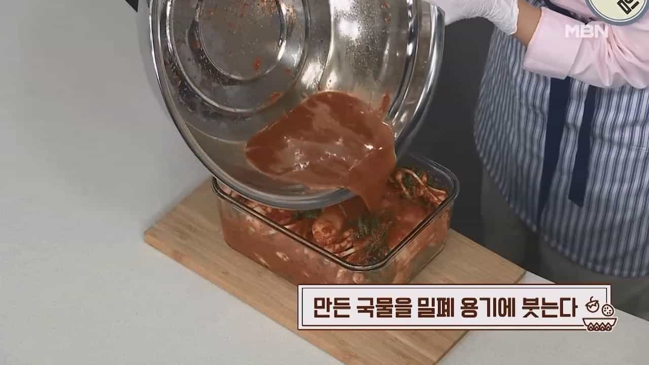 18. 만든 국물을 밀폐용기에 적당히 부어줍니다.