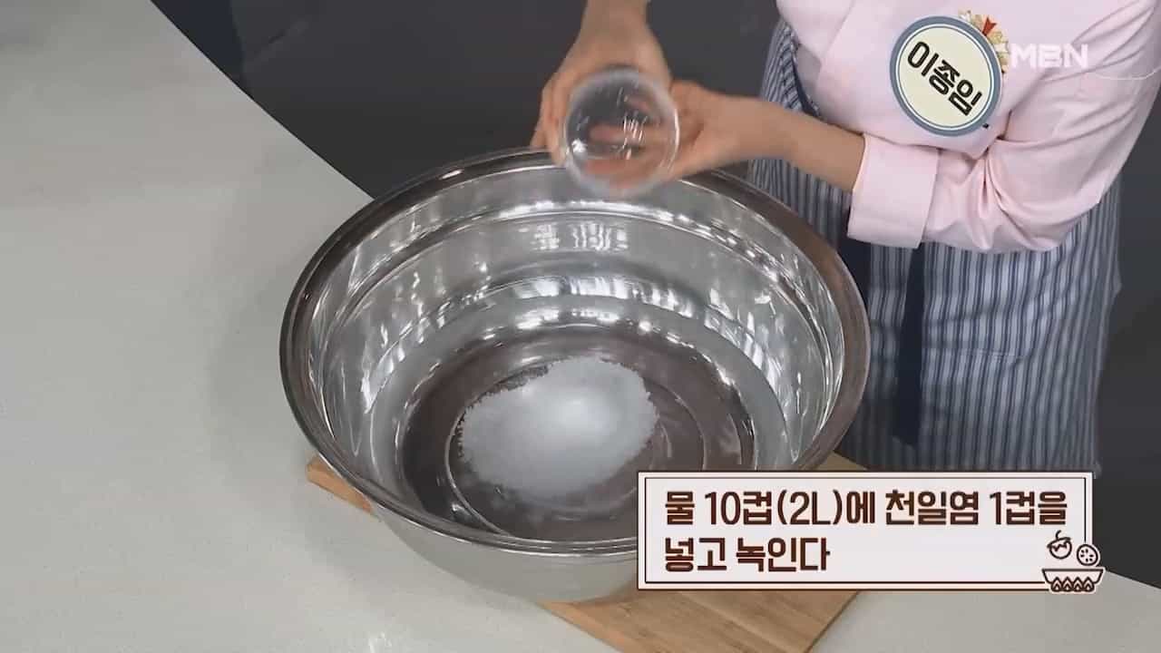 1. 물 10컵 (2리터)에 천일염 1컵을 넣고 잘 녹여줍니다.
