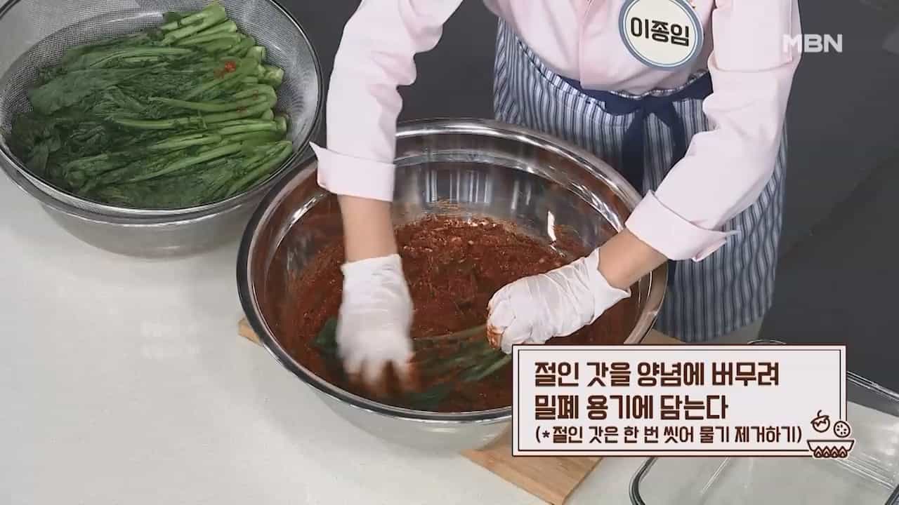 14. 한번 씻어 물기를 제거한 절인 갓을 양념에 버무려 밀폐 용기에 담아줍니다.