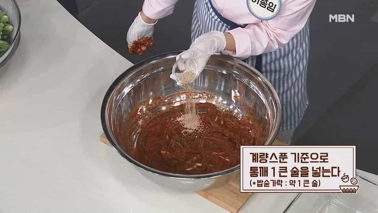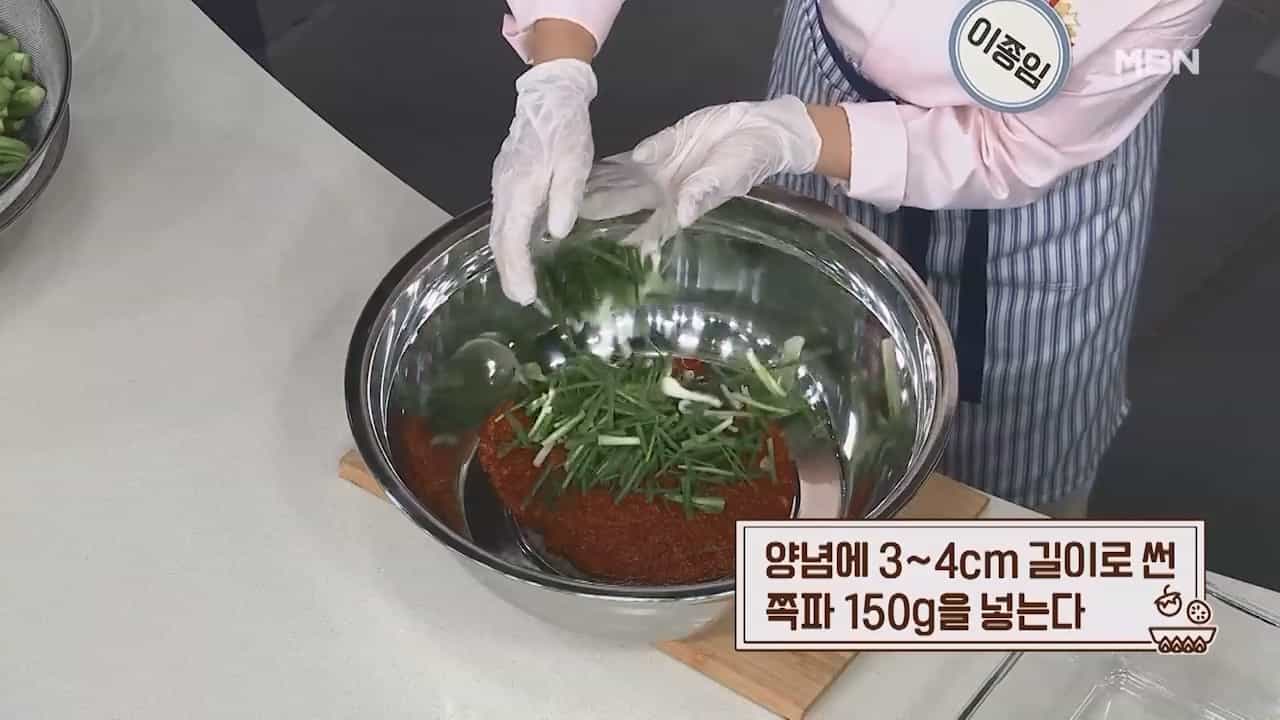 12. 양념에 3~4cm 길이로 썬 쪽파 150g을 넣어줍니다.