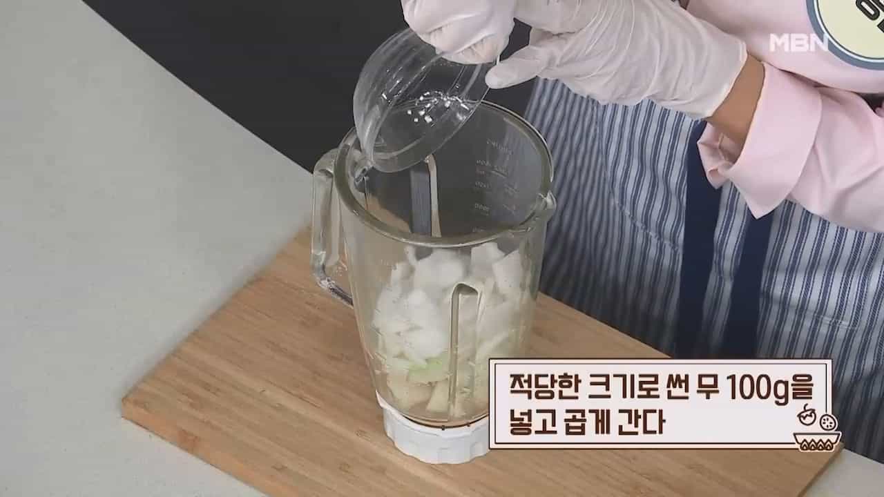 6. 적당한 크기로 썬 무 100g을 넣고 곱게 갈아줍니다.