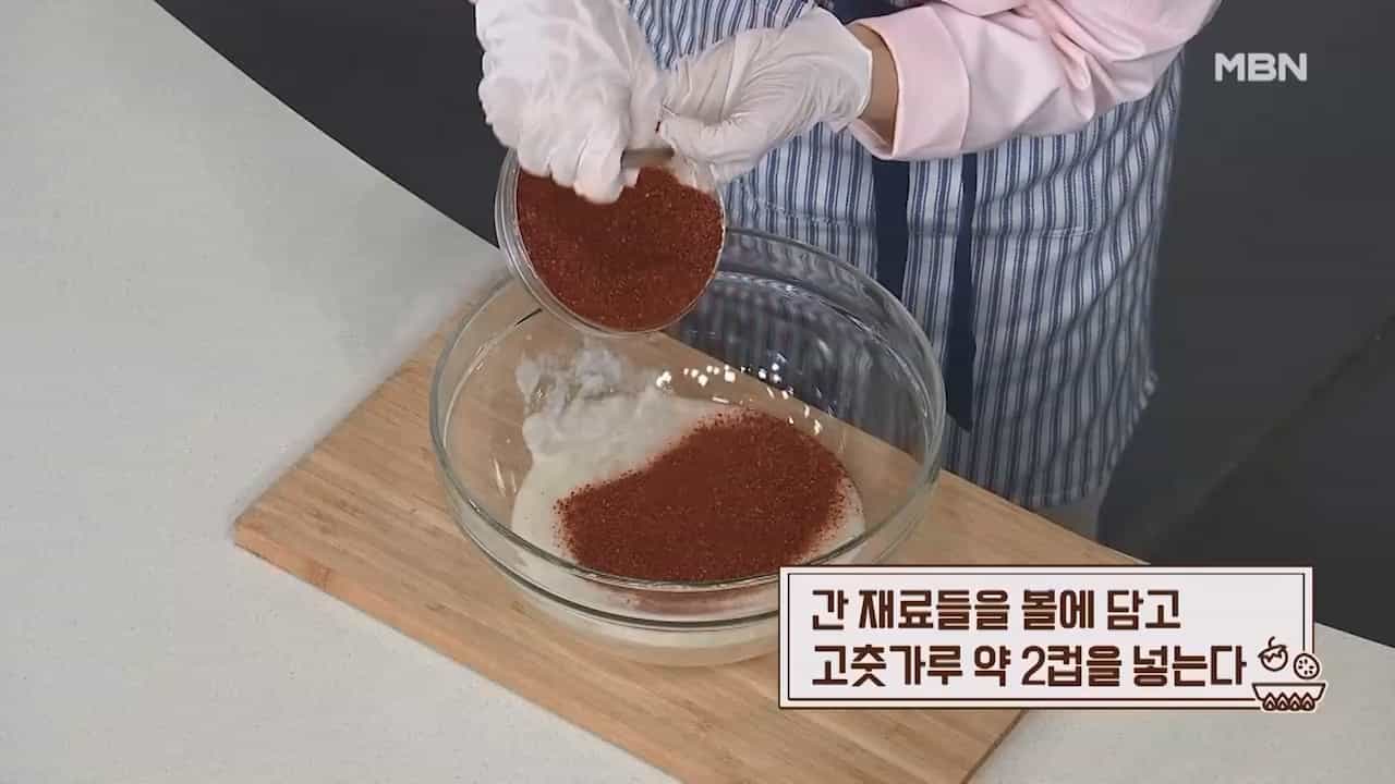 7. 간 재료들을 볼에 담고 고춧가루 약 2컵을 넣어줍니다.