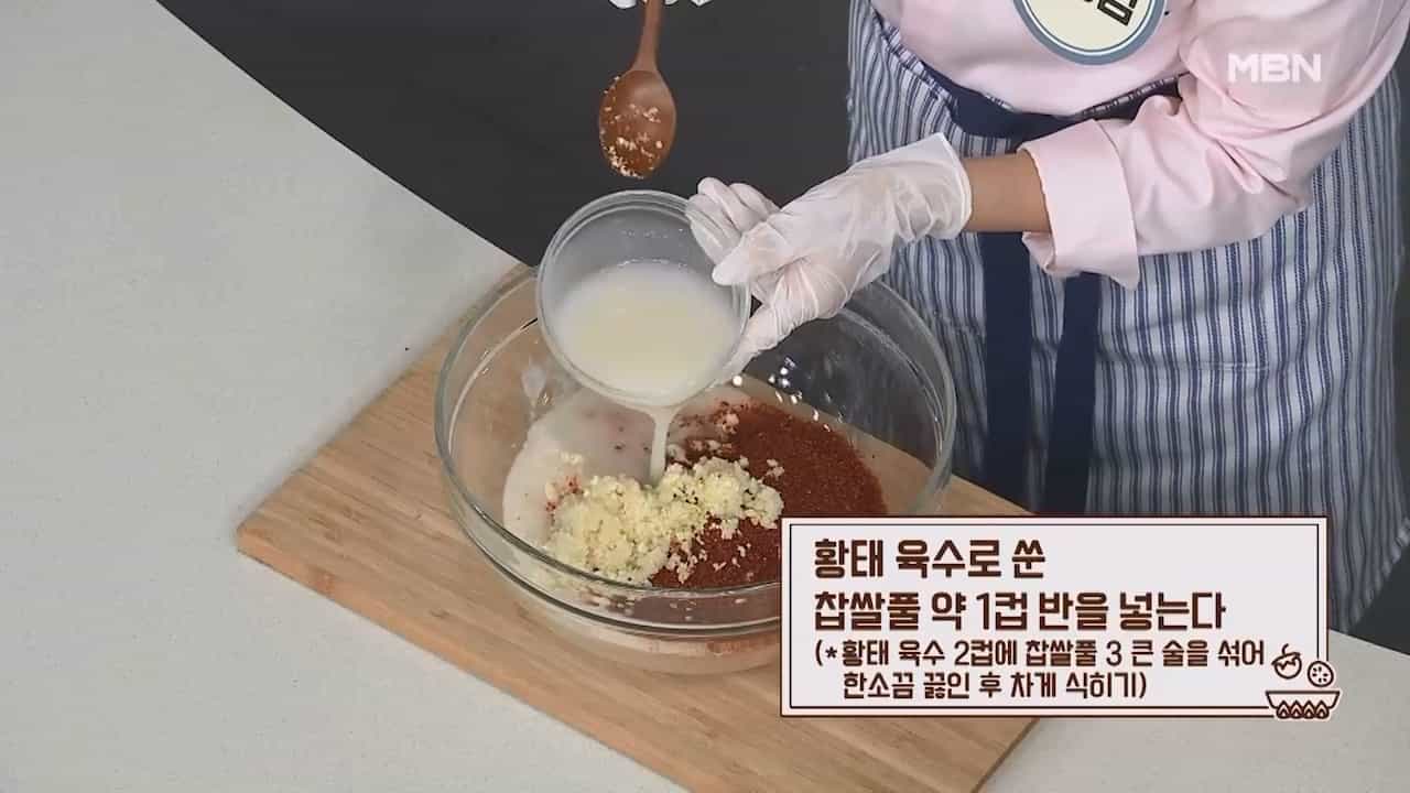 10. (황태육수 2컵에 찹쌀풀 3큰술을 섞어 한소끔 끓인 후 차게 식힌) 황태 육수로 쑨 찹쌀풀을 약 1컵 반을 넣어줍니다.