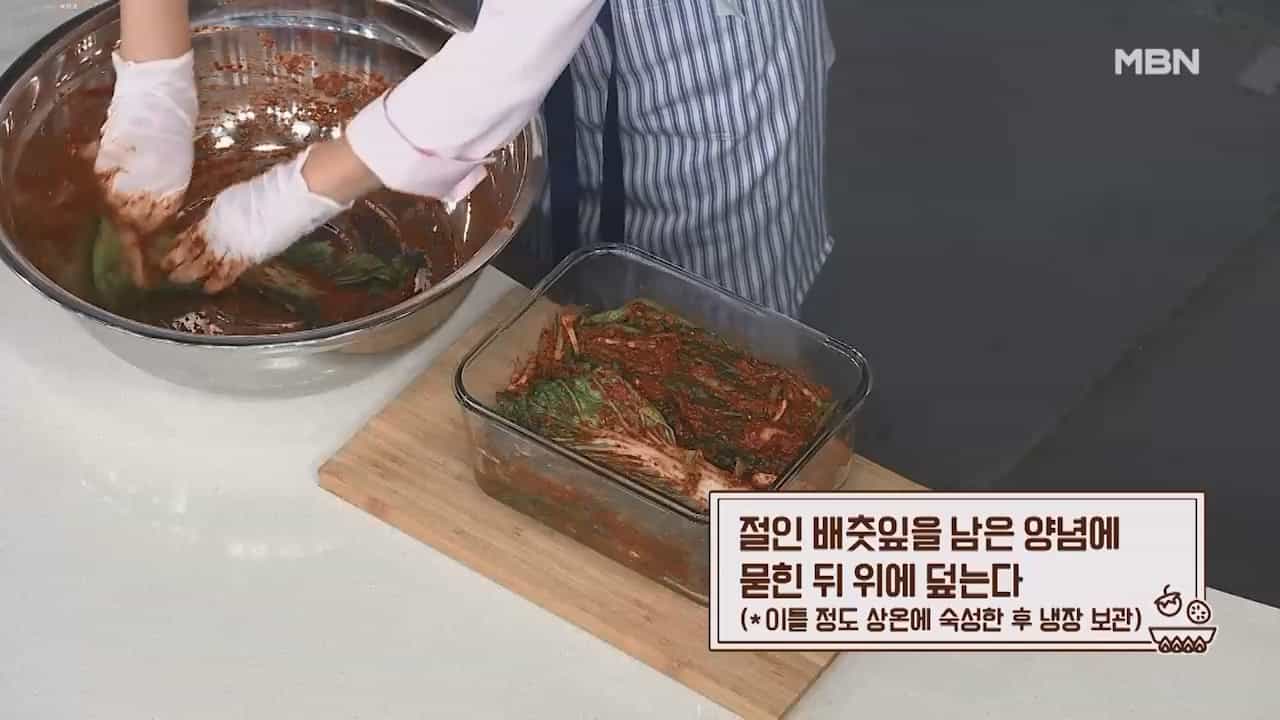 15. 절인 배춧잎을 남은 양념에 묻힌 뒤 갓김치 위에 덮어 이틀 정도 상온에 숙성한 후 냉장보관하면 맛있는 갓김치가 완성됩니다.