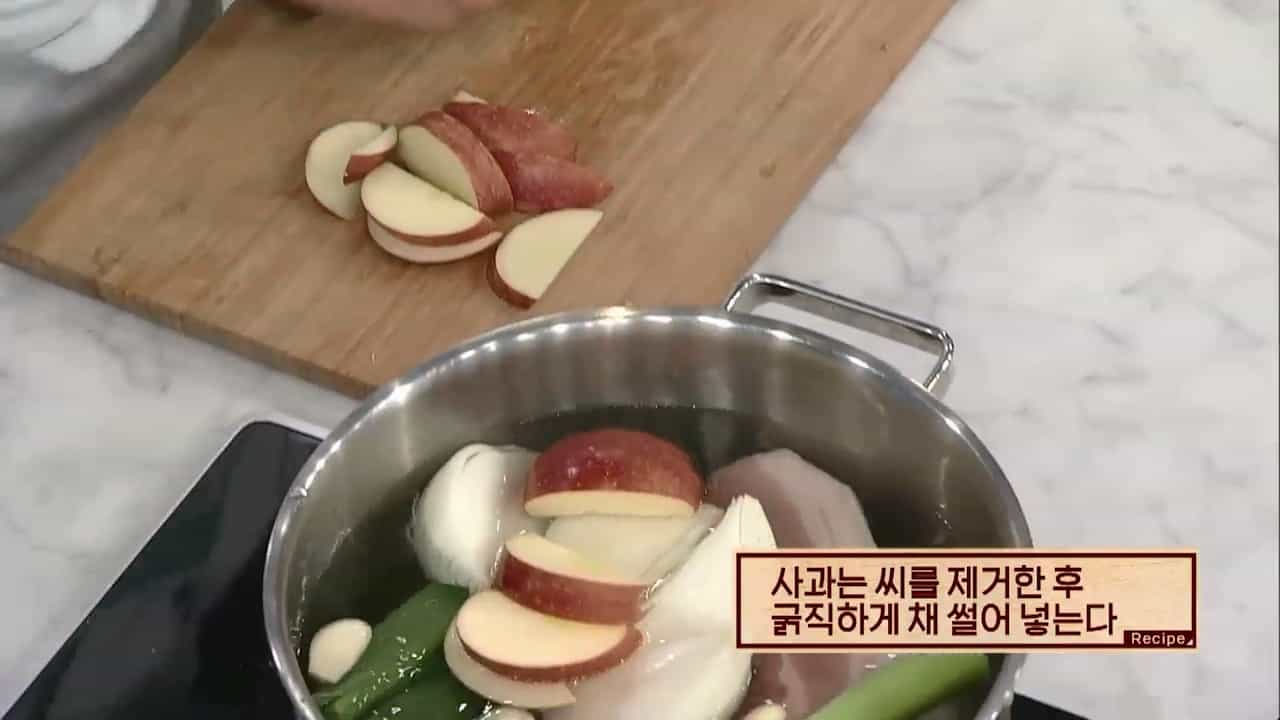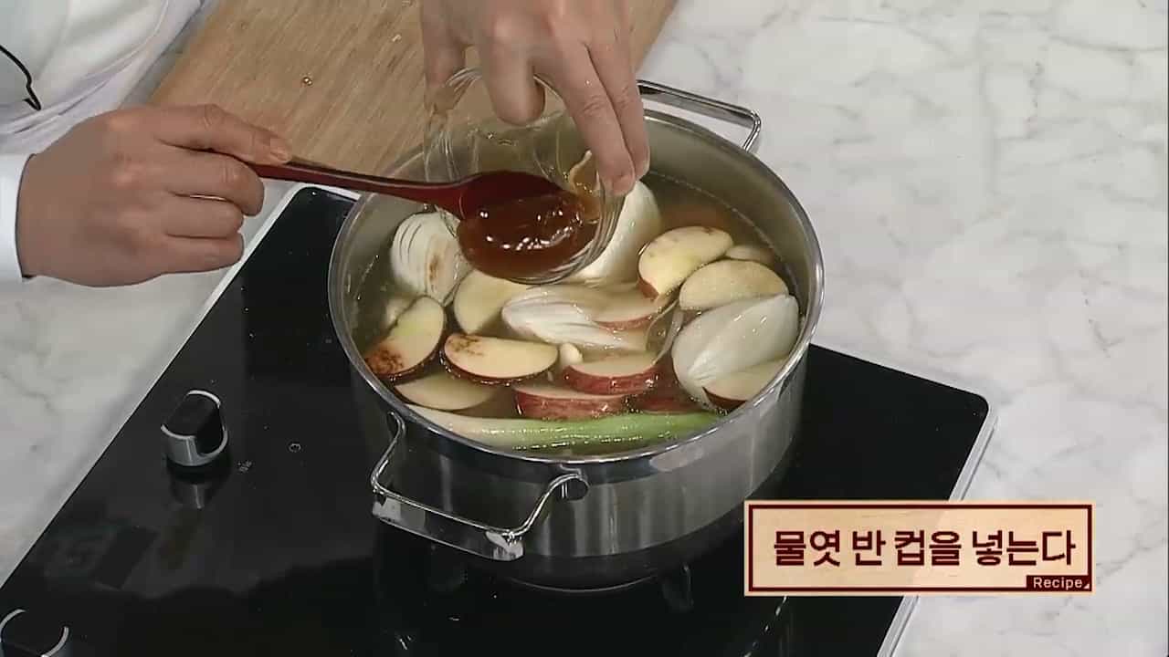 4. 씨를 제거한 사과 1개를 굵직하게 채 썰어 넣습니다. (사과를 넣어서 수육을 하면 사과향이 돼지 누린내를 잡고 연육 효과로 고기가 더 부드러워진다고 합니다.)