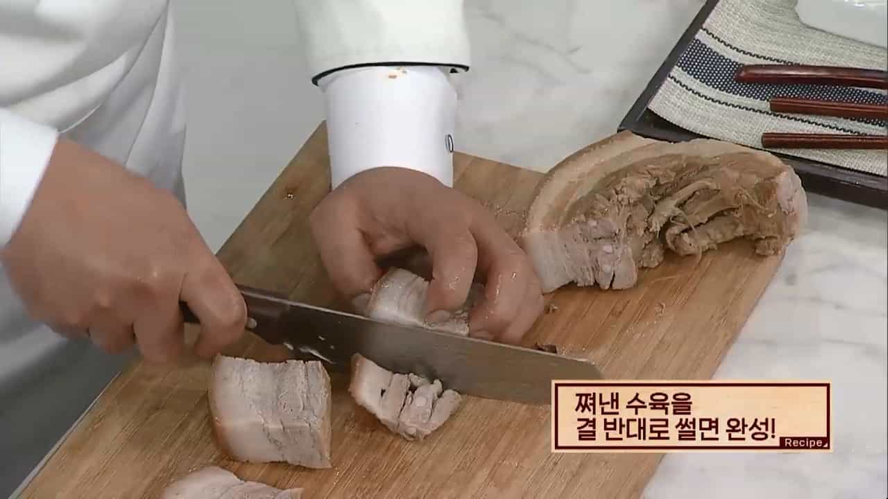 12. 쪄낸 수육을 결 반대로 썰면 맛있는 수육이 완성됩니다.