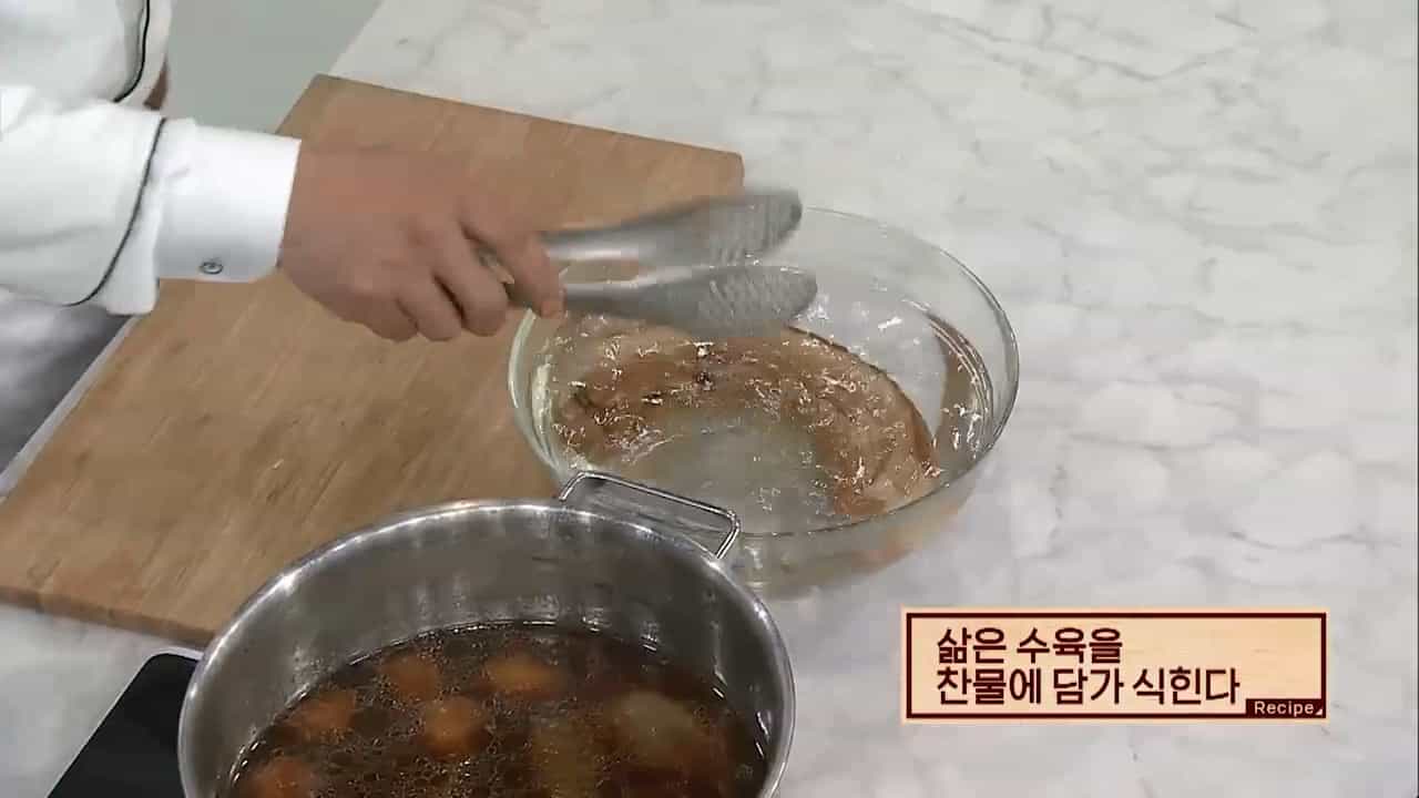 8. 삶은 수육을 찬물에 담가 식혀줍니다. (삶은 돼지고기를 찬물에 씻어내면 표면에 묻은 기름기를 제거 할 수 있고 찬물로 인해 식감도 더 쫄깃쫄깃해진다고 합니다.)
