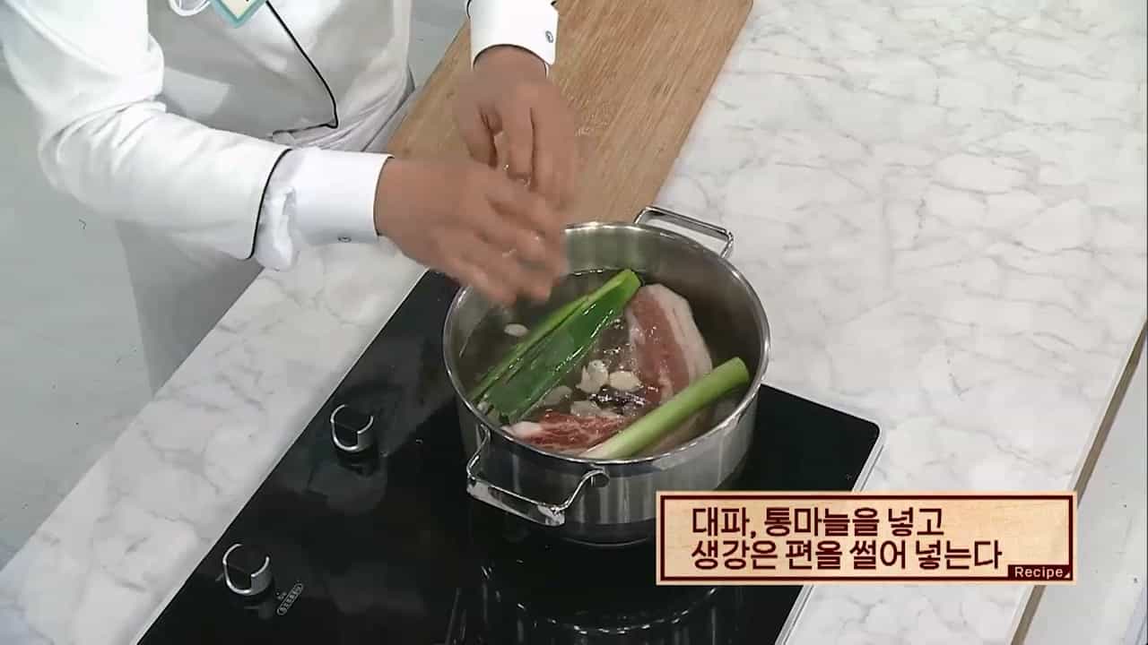 2. 대파 한뿌리, 살짝 으깬 통마늘 5알을 넣고 생강 1알은 편을 썰어 넣습니다.