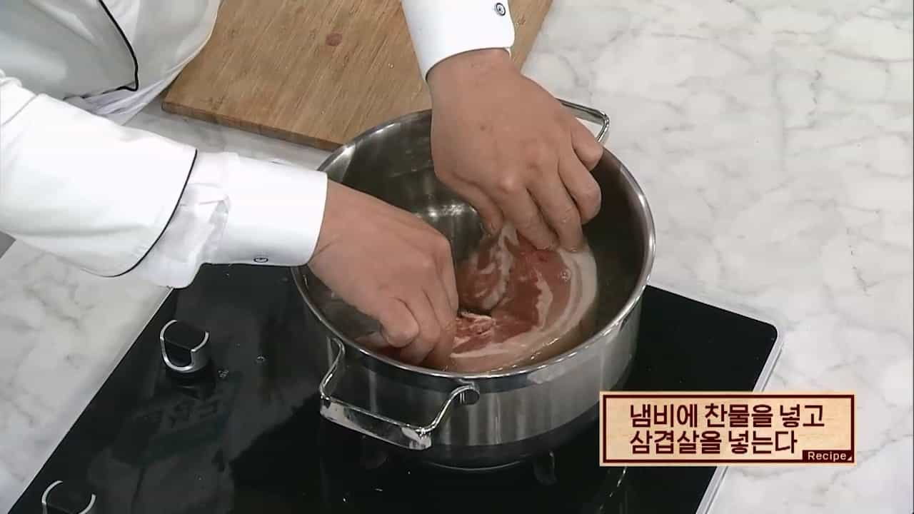 1. 냄비에 찬물을 넣고 삼겹살을 넣어줍니다.