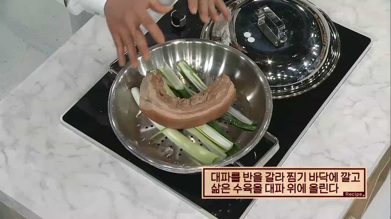 9. 대파를 반을 갈라 찜기 바닥에 깔고 삶은 수육을 대파 위에 올려줍니다.