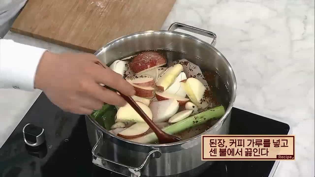 5. 된장 2큰술, 커피 가루 1큰술을 넣고 센불에서 끓여줍니다. (커피 가루를 넣어주면 잡내를 제거하는 효과가 있다고 합니다.)