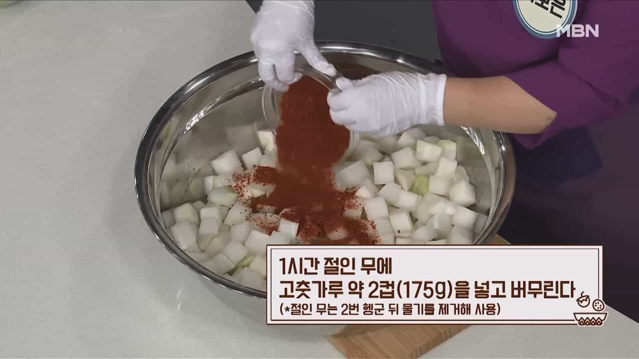 14. 1시간 절인 무를 2번 헹군 뒤 물기를 제거해 고춧가루 약 2컵 (175g)을 넣고 버무려 줍니다.