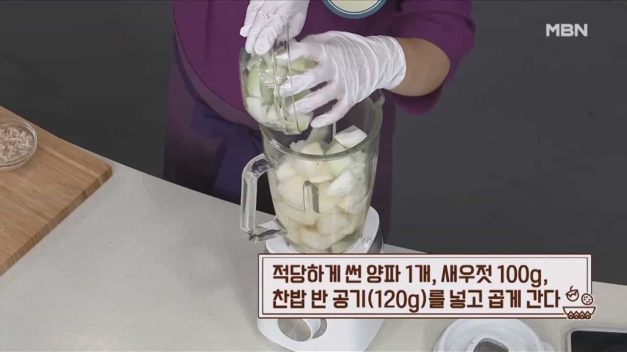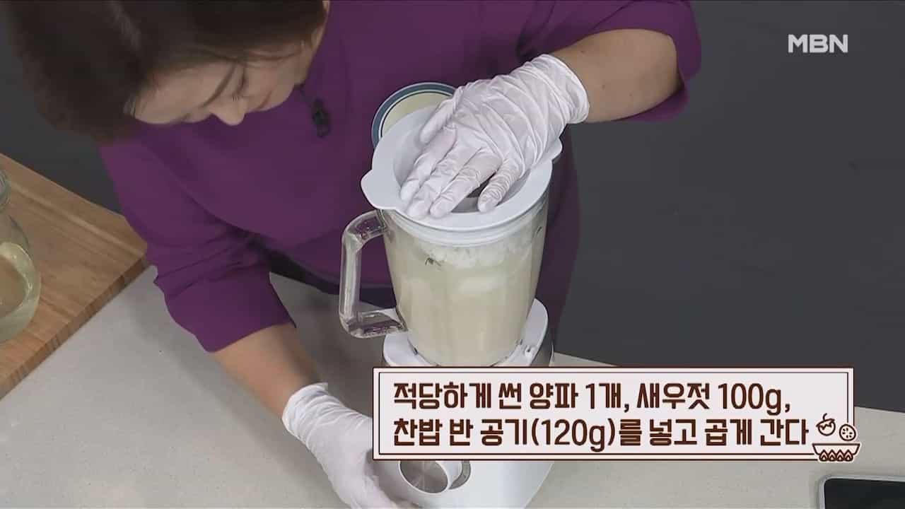 8. 적당하게 썬 양파 1개, 새우젓 100g, 찬밥 반공기 (120g)를 넣고 곱게 갈아줍니다.