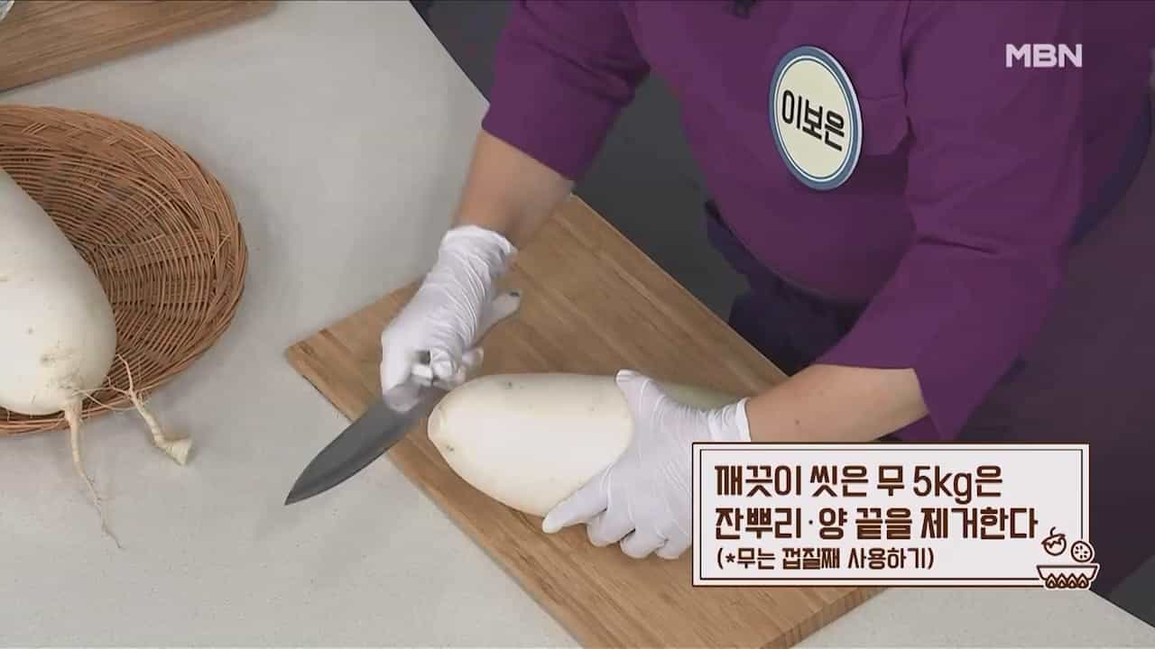 1. 깨끗이 씻은 무 5kg은 잔뿌리, 양 끝을 제거해 줍니다. (무는 껍질째 사용합니다.)