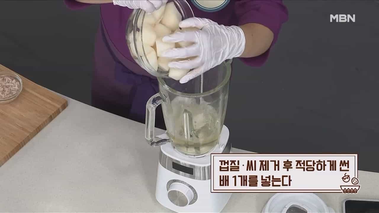 7. 껍질과 씨를 제거한 배 1개를 적당하게 썰어서 믹서기에 넣습니다.