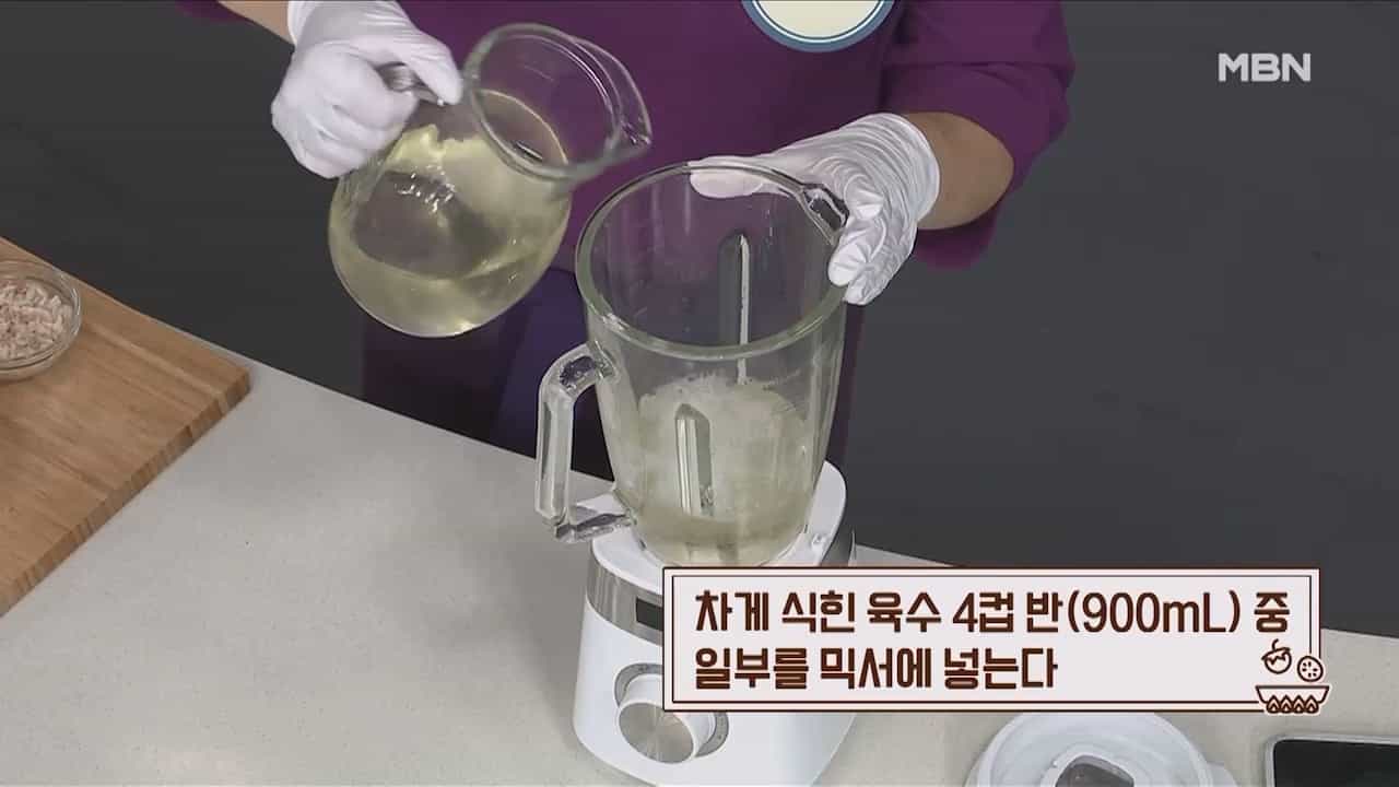 6. 차갑게 식힌 육수 4컵 반(900mL) 중 일부를 믹서기에 넣어줍니다.