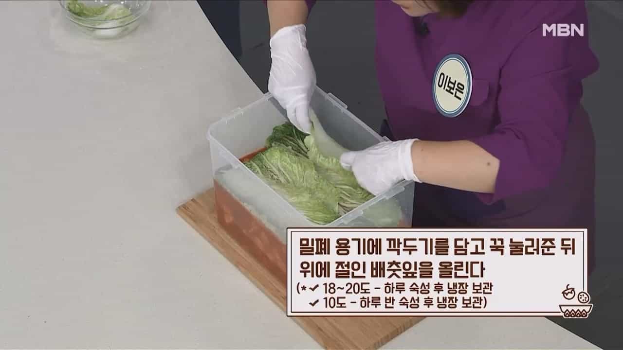 18. 밀폐 용기에 깍두기를 담고 꾹 눌러준 뒤 위에 절인 배춧잎을 올려주면 맛있는 깍두기가 완성됩니다. ( 18~20도에서 하루 숙성 후 냉장보관하거나 10도에서 하루 반 숙성 후 냉장보관)