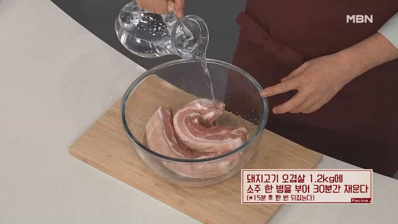 1. 돼지고기 오겹살 1.2kg에 소주 한병을 부어 30분간 재웁니다. (15분 후 한번 뒤집어 줍니다.)