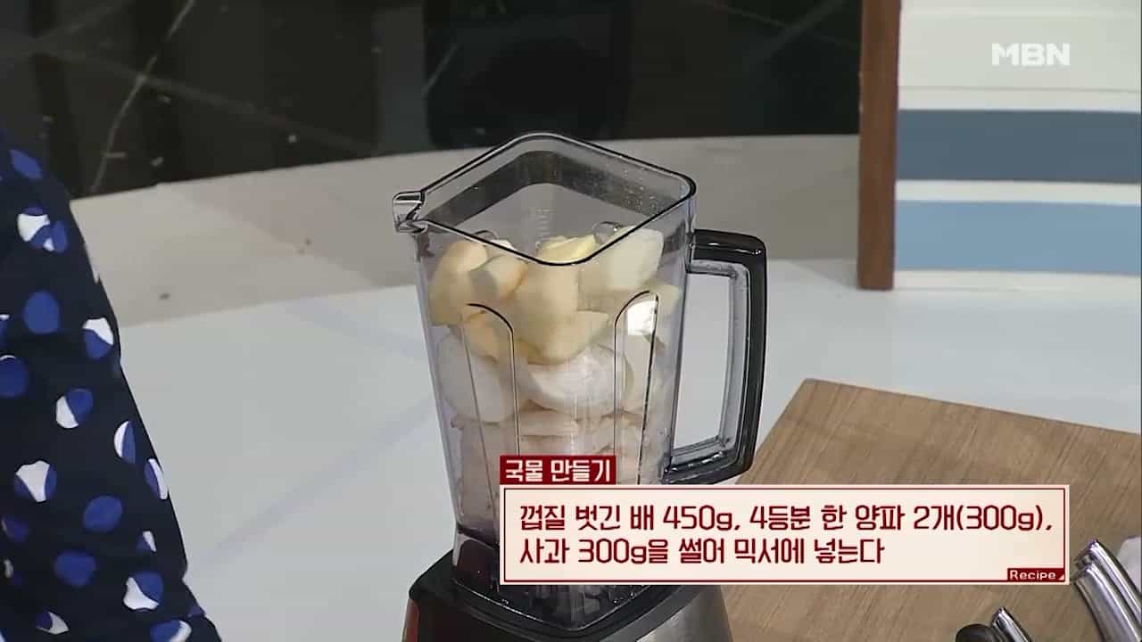 9. 껍질 벗긴 배 450g, 4등분 한 양파 2개(300g), 사과 300g을 썰어 믹서기에 넣습니다.