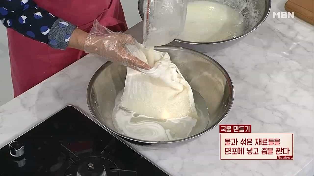 13. 물과 섞은 재료들을 면포에 넣고 즙을 짜줍니다.