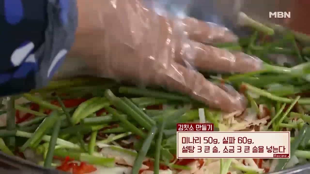 8. 미나리 50g, 실파 60g, 설탕 3큰술, 소금 3큰술을 넣고 버무려 주면 김칫소가 완성됩니다.