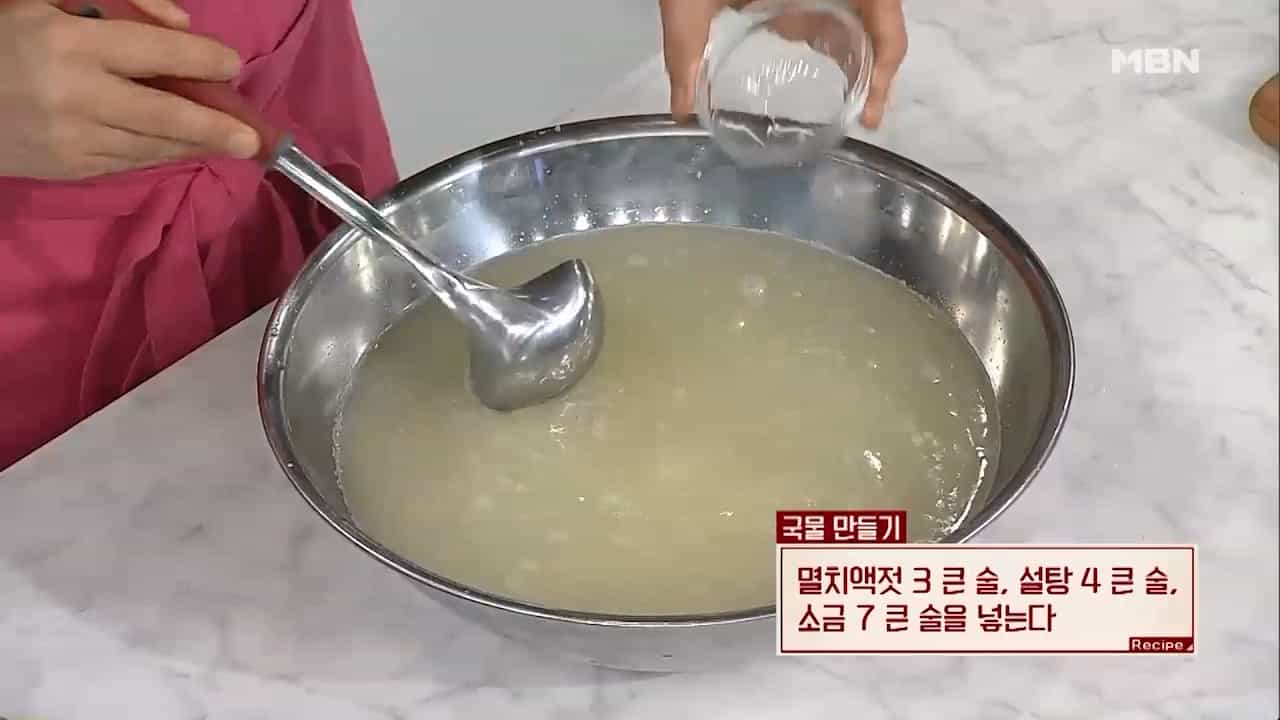 14. 멸치액젓 3큰술, 설탕 4큰술, 소금 7큰술을 넣어 잘 섞어주면 백김치 국물이 완성됩니다.
