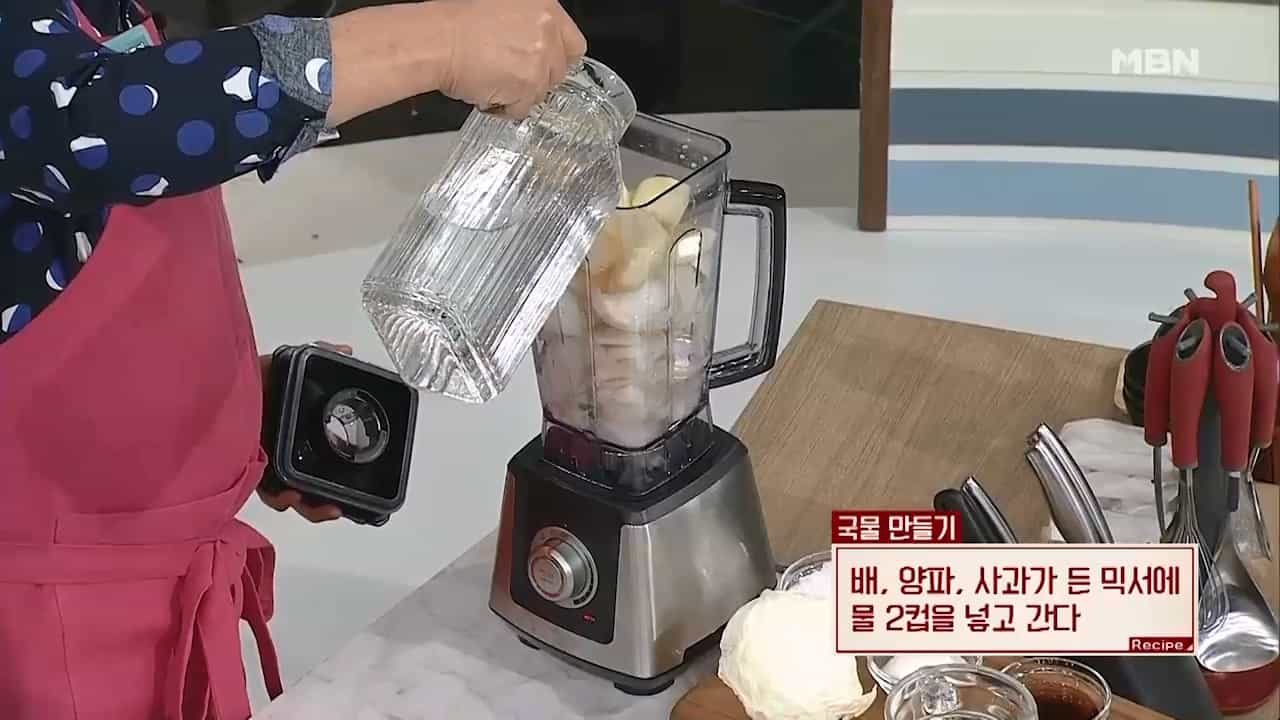 10. 배, 양파, 사과가 든 믹서기에 물 2컵을 넣고 갈아줍니다.