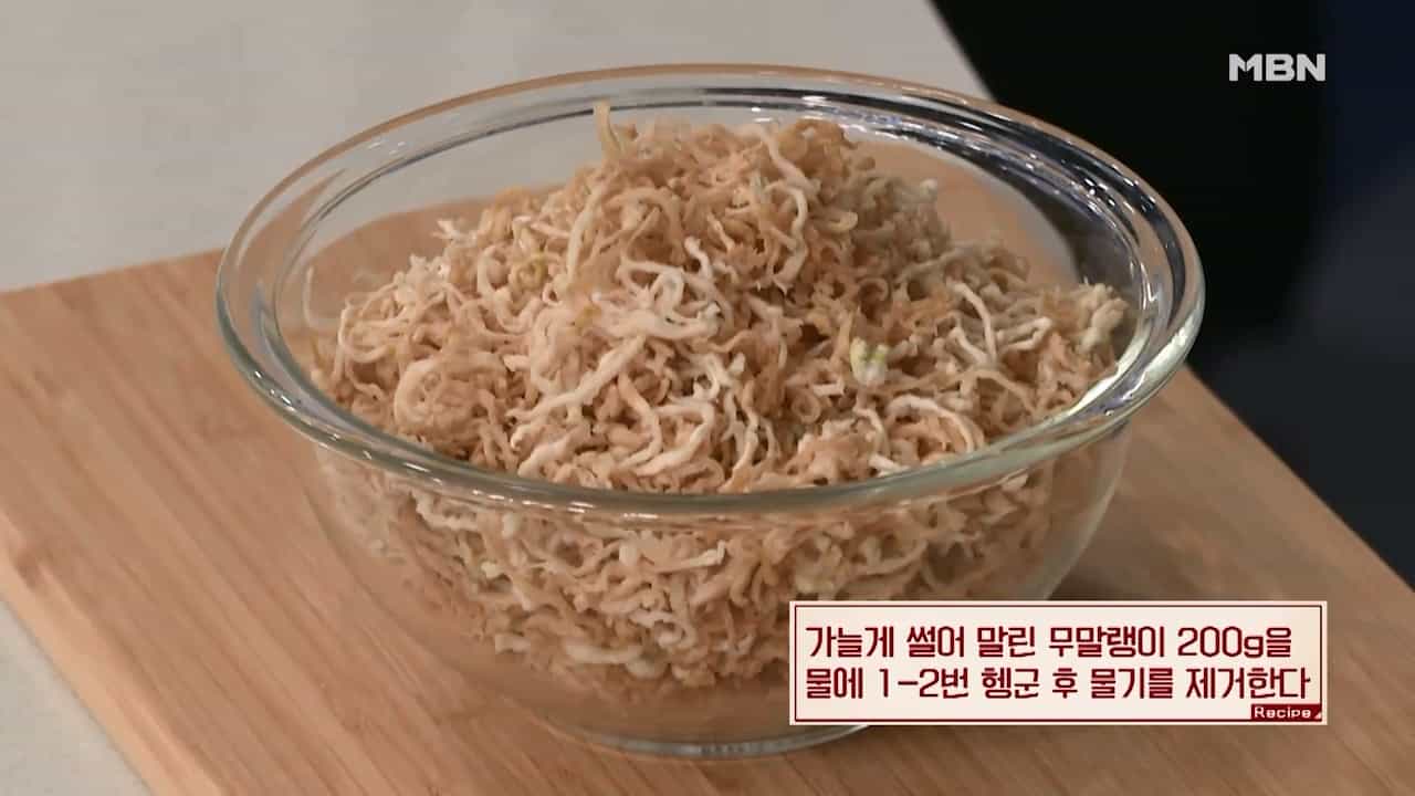 2. 가늘게 썰어 말린 무말랭이 200g을 물에 1~2번 헹군 후 물기를 제거합니다.