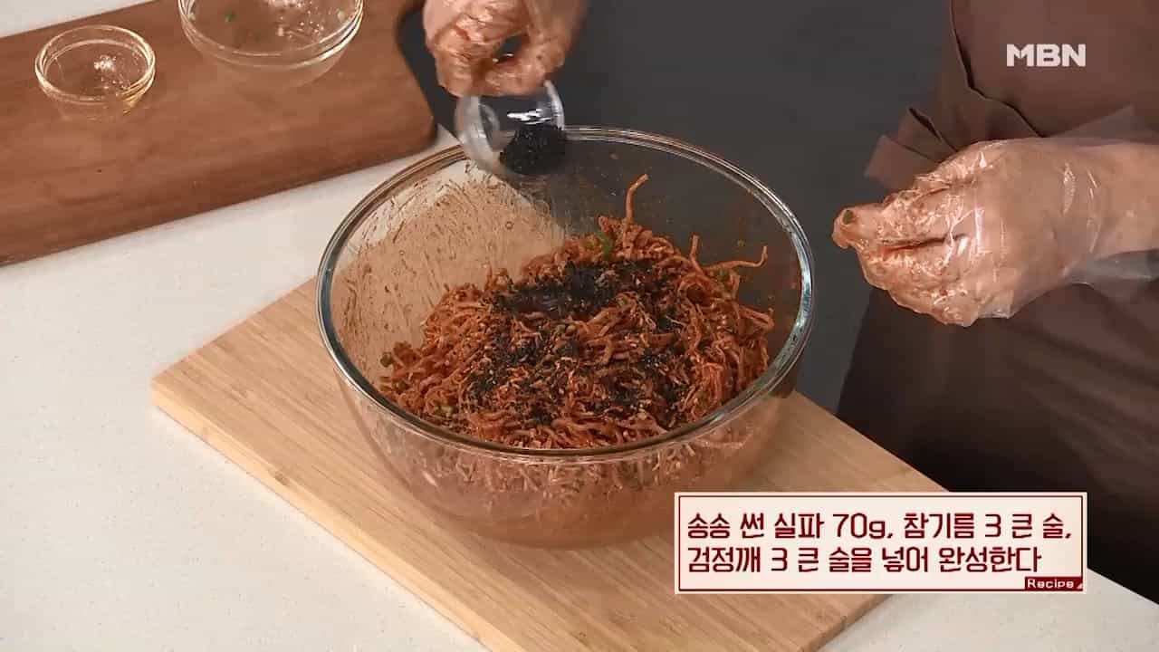 7. 송송 썬 실파 70g, 참기름 3큰술, 검정깨 3큰술을 넣어 잘 버무려 주면 부드럽고 맛있는 진미채무침이 완성됩니다.