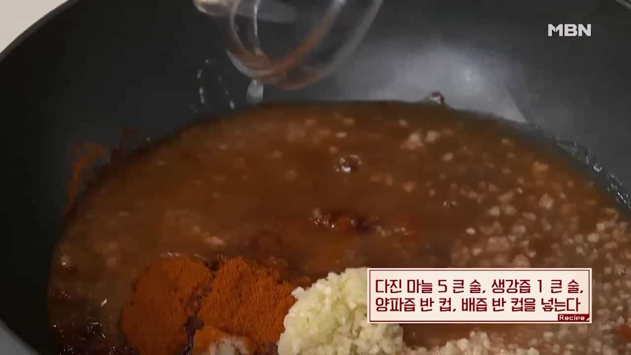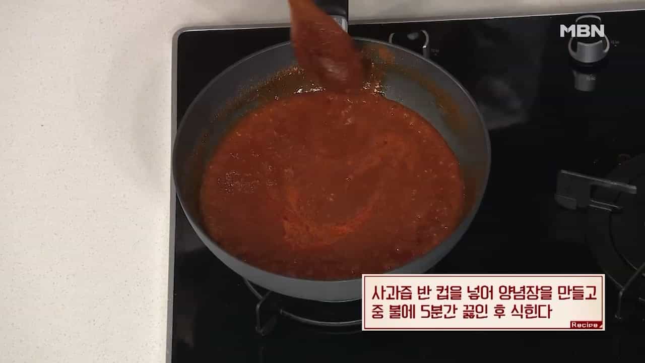 5. 사과즙 반컵을 넣어 양념장을 만들고 중 불에 5분간 끓인 후 식혀줍니다.