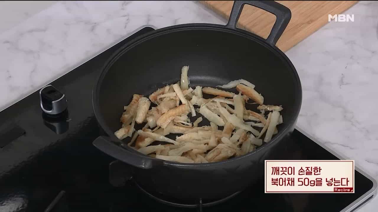 5. 참기름 2큰술을 넣고 북어채를 2분간 볶아줍니다.