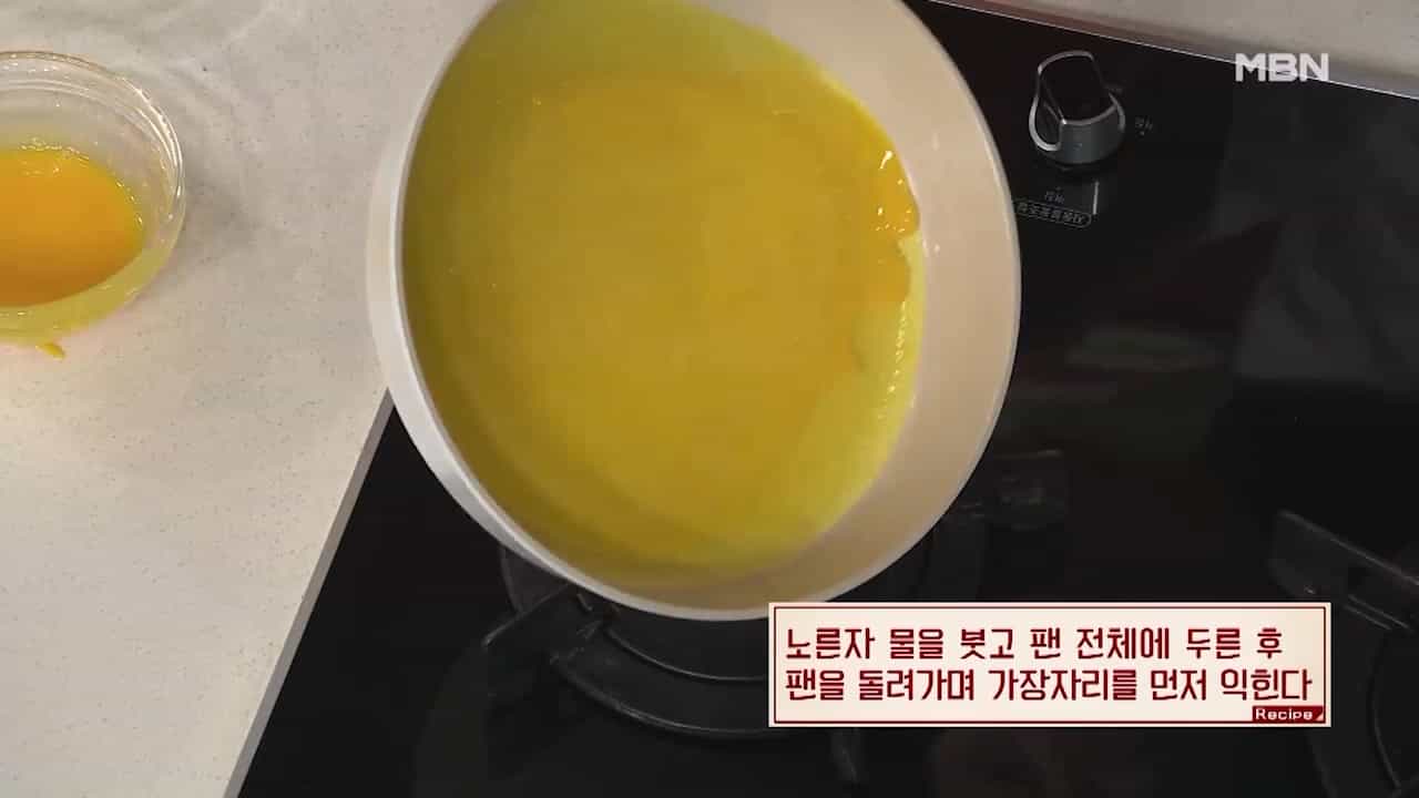 10. 노른자 물을 붓고 팬 전체에 두른 후 팬을 돌려가며 가장자리를 먼저 익혀줍니다.