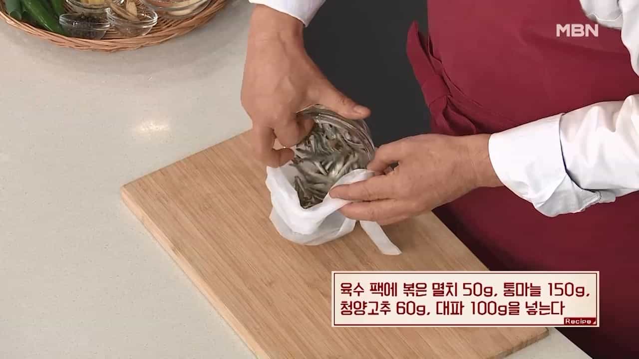 2. 육수 팩에 볶은 멸치 50g, 통마늘 150g, 청양고추 60g, 대파 100g을 넣습니다.
