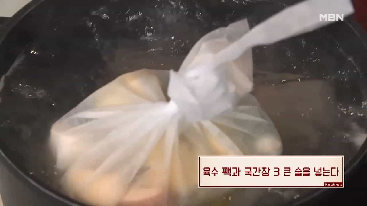 5. 냄비에 육수팩과 국간장 3큰술을 넣고 끓여서 육수를 만듭니다.