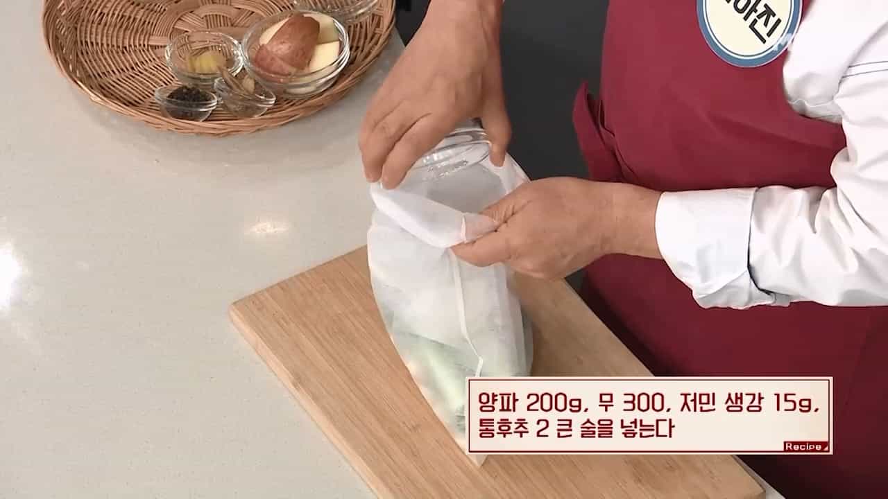 3. 육수팩에 200g, 무 300g, 저민 생강 15g, 통후추 2큰술을 넣습니다.