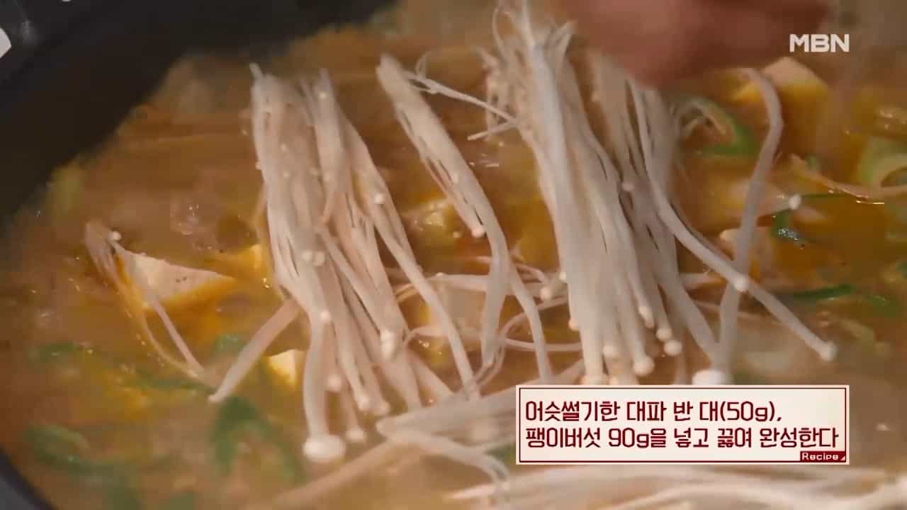 13. 어슷썰기한 대파 반 대(50g), 팽이버섯 90g을 넣고 끓이면 맛있는 청국장이 완성됩니다.