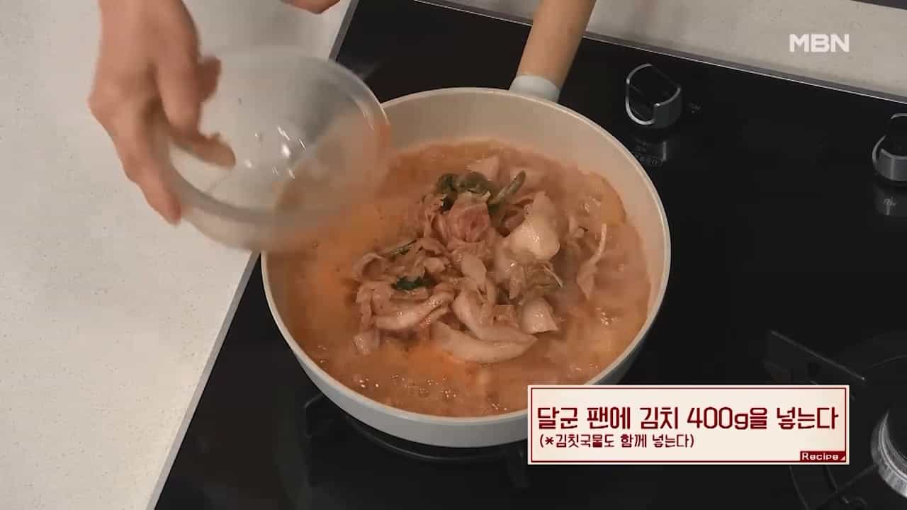 4. 달군 팬에 김치 400g을 김칫국물과 함께 넣습니다.
