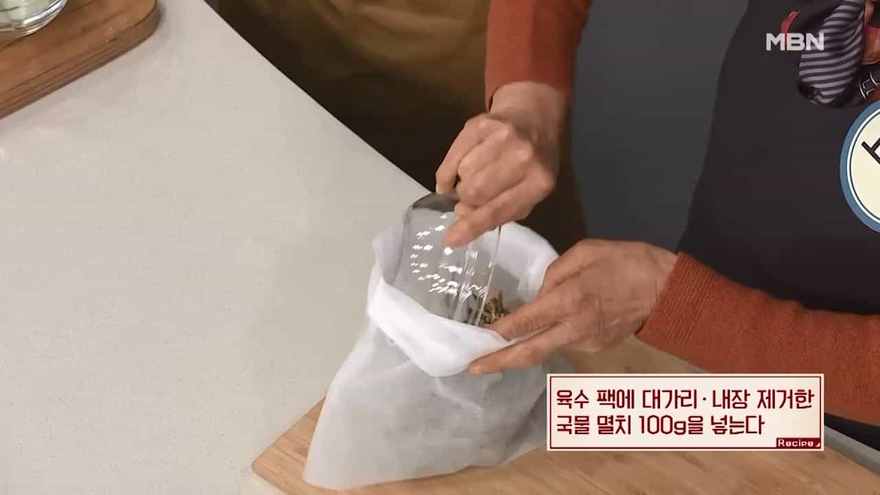 1. 육수팩에 대가리와 내장을 제거한 국물 멸치 100g을 넣습니다.