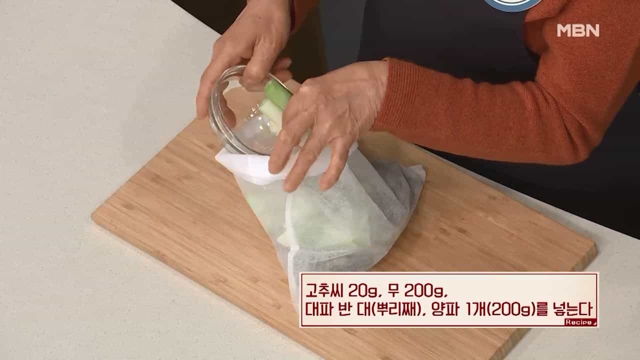 2. 고추씨 20g, 무 200g, 대파 반 대(뿌리째), 양파 1개(200g)를 넣습니다.