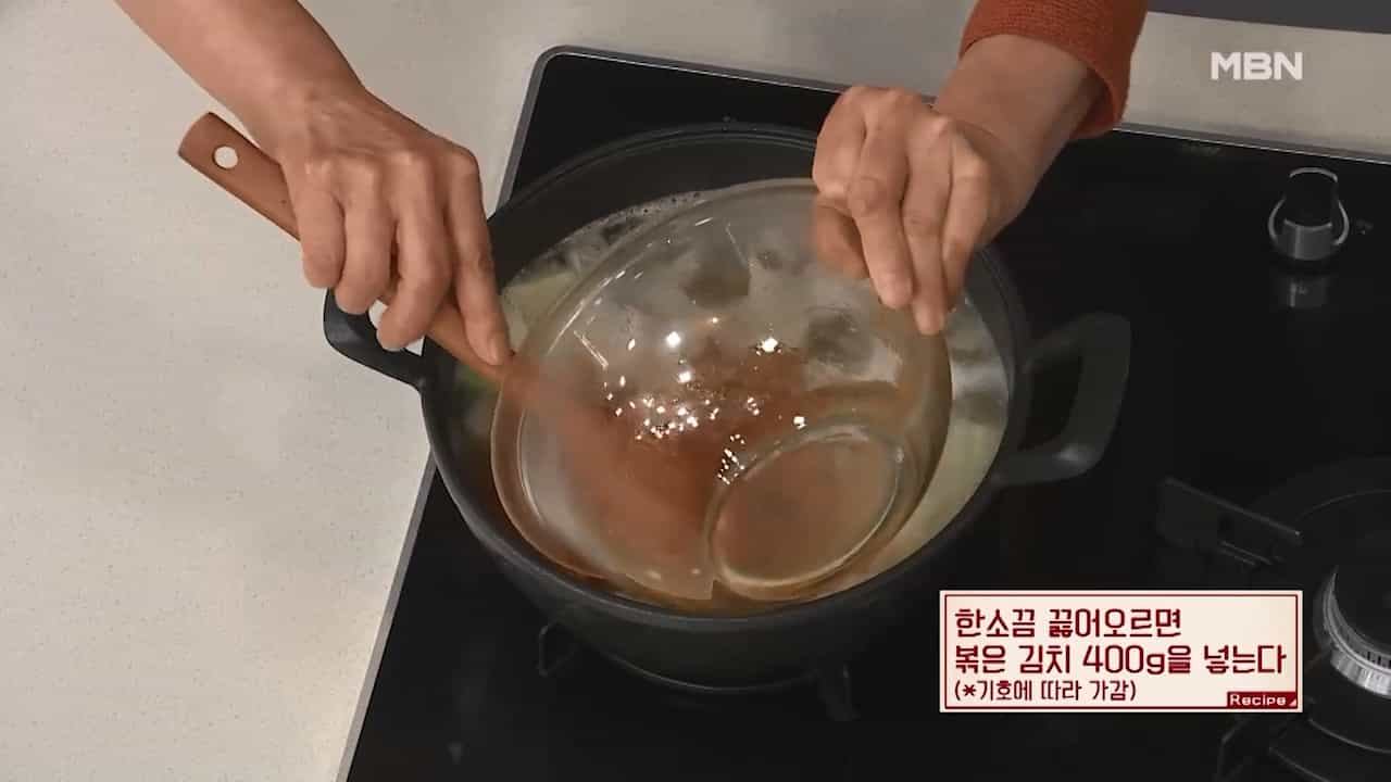 10. 한소끔 끓어오르면 볶은 김치 400g을 넣습니다. (볶은김치는 기호에 따라 가감합니다.)