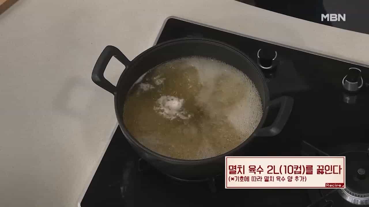 7. 멸치 육수 2리터(10컵)를 끓여줍니다. (기호에 따라 멸치 육수 양을 추가합니다.)