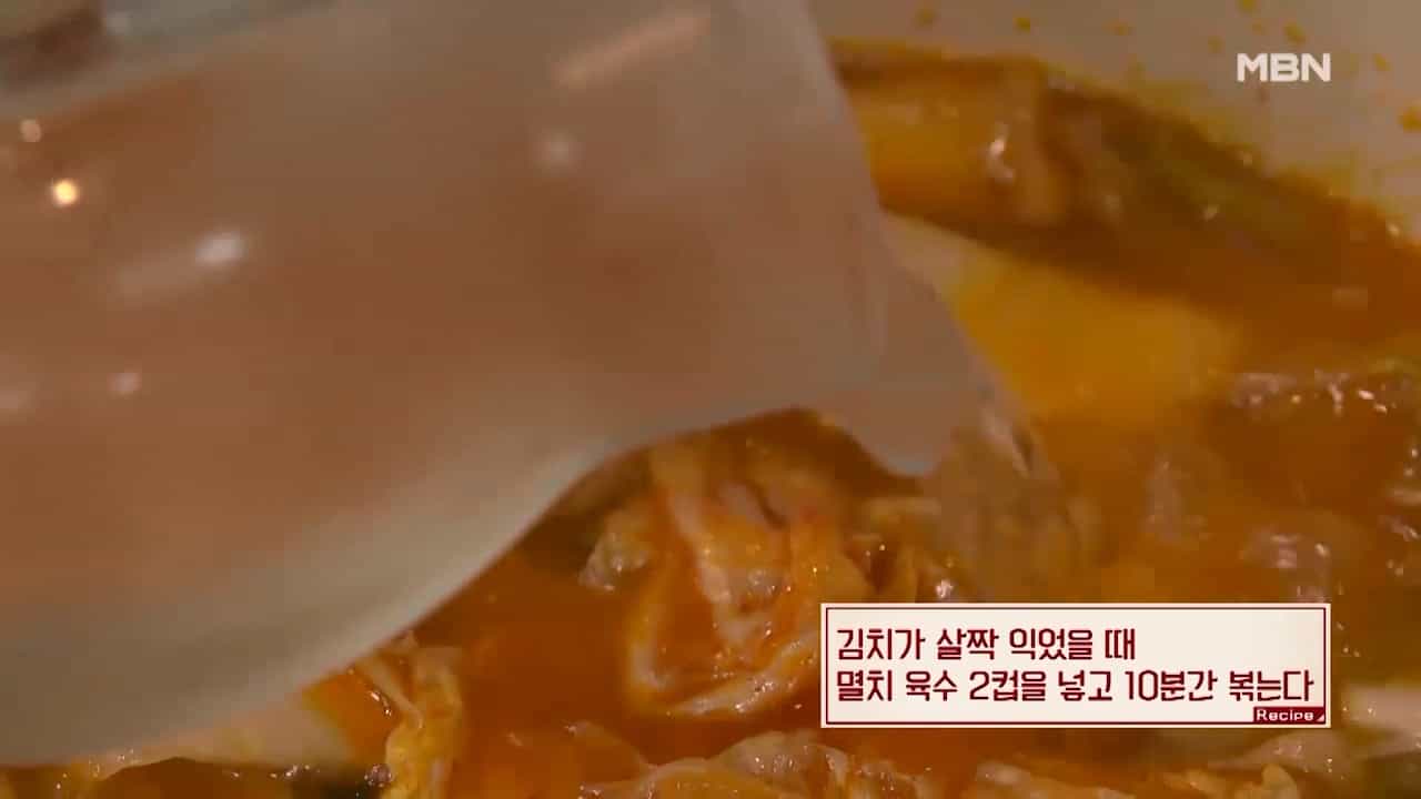 6. 김치가 살짝 익었을때 멸치 육수 2컵을 넣고 10분간 볶아줍니다.