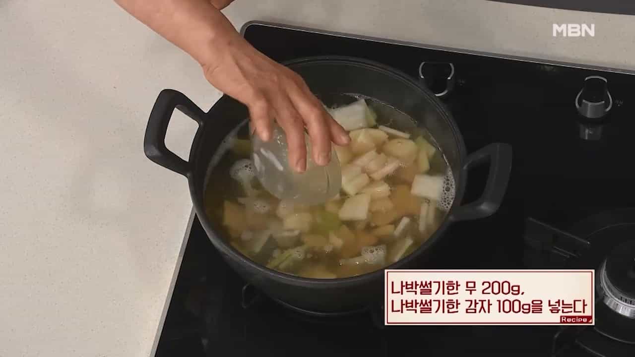 8. 나박썰기한 무 200g, 나박썰기한 감자 100g을 넣습니다.