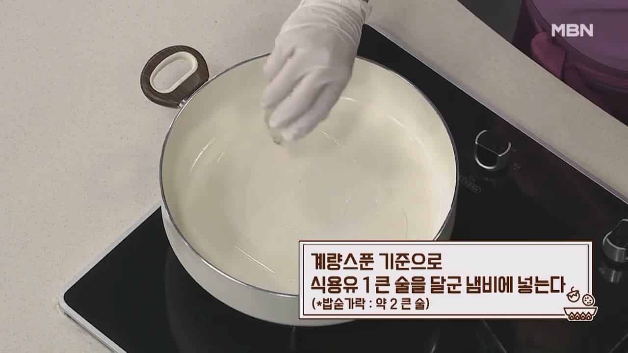 5. 계량스푼 기준으로 식용유 1큰술을 달군 냄비에 넣습니다. (밥숟가락 약 2큰술)