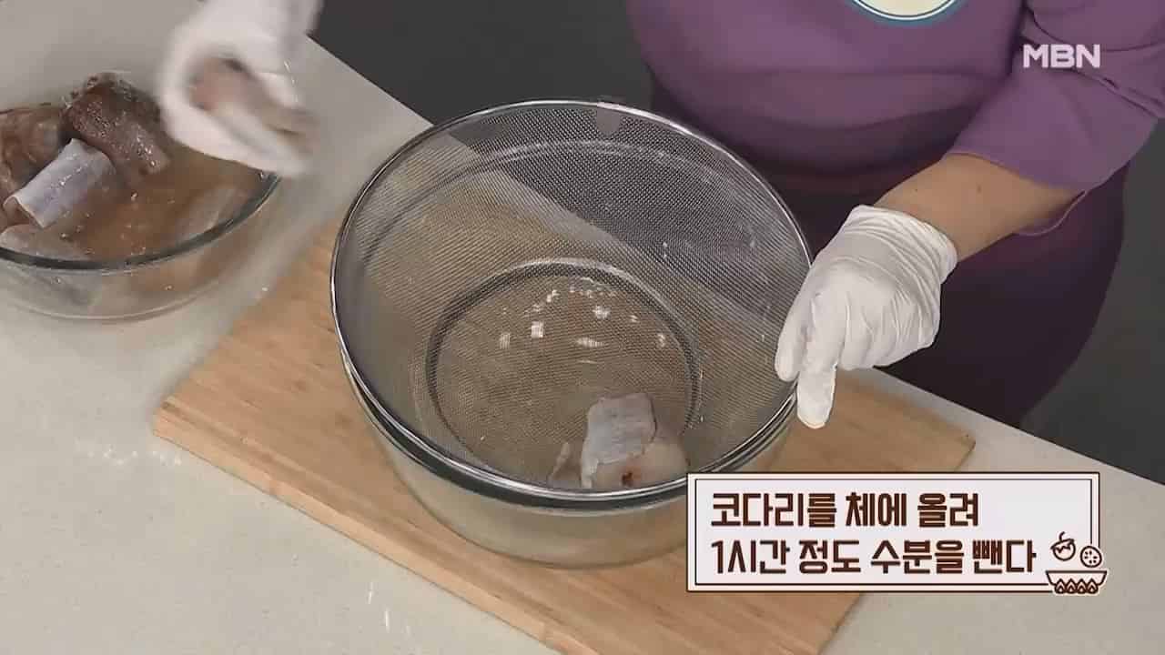 4. 코다리를 체에 올려 1시간 정도 수분을 빼줍니다.